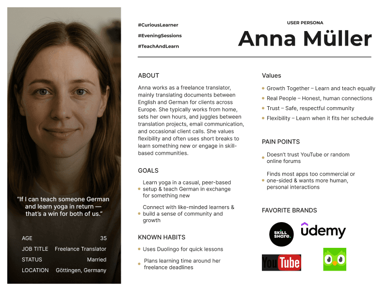 This project was part of my Master’s in User Experience Management & Design, where we tackled real-world design problems using structured methodologies. The goal was to create a meaningful platform that empowers individuals to teach what they know and learn what they need—without financial or geographic barriers.